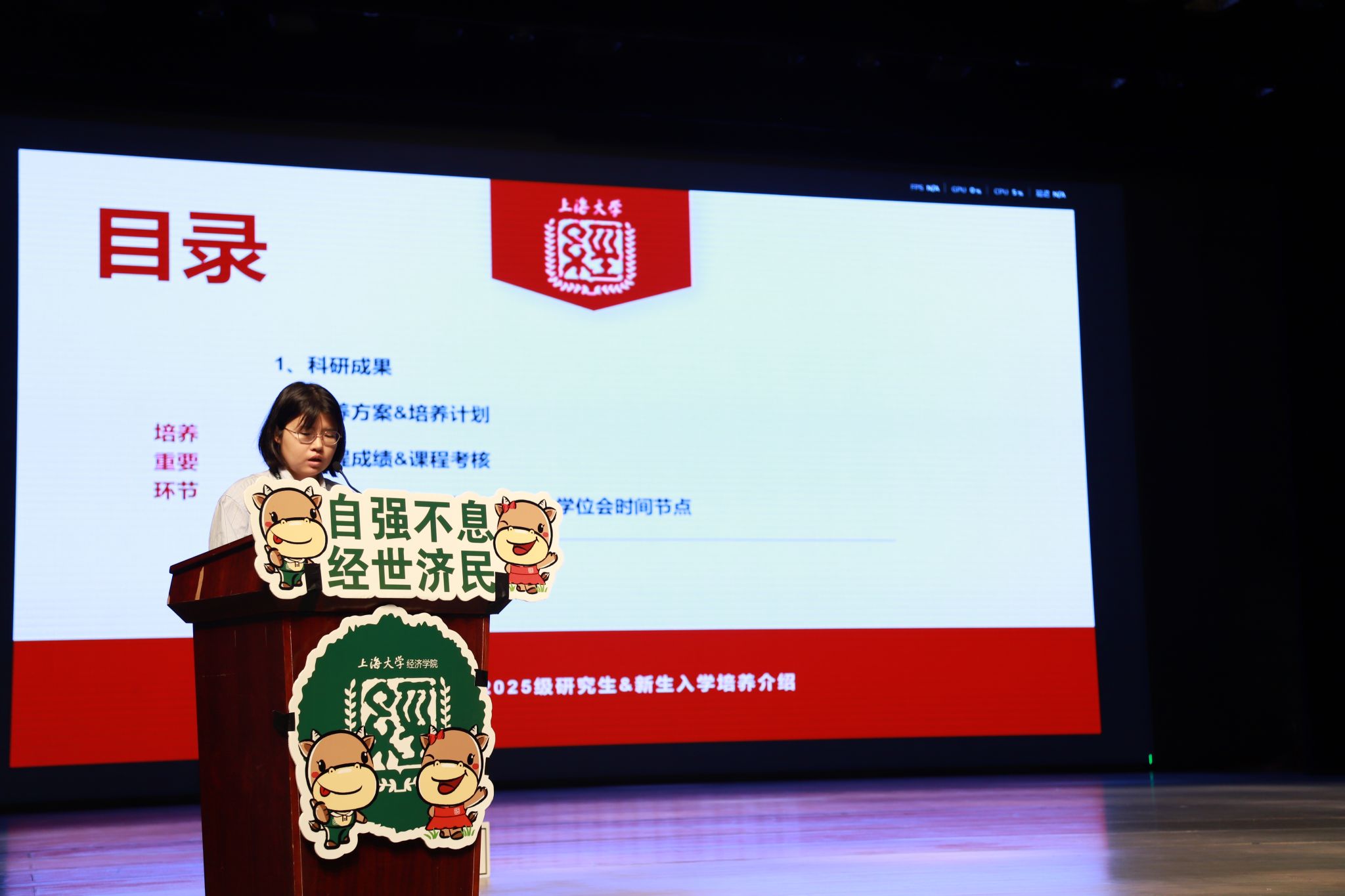 上篇:你好,新同学! 9月19日下午,“经年之约 ‘济’往开来”——太阳集团城娱87222025级新生开学典礼在宝山校区伟长楼隆重举行。太阳集团城娱8722党委副书记、常务副院长殷凤,太阳集团城娱8722党委副书记、副院长冯玉鑫,副院长毛雁冰、刘康兵、谭静,产经中心副教授刘亚洲,校友代表、招商证券浦东南路营业部负责人井涛等领导嘉宾出席本次典礼。2025级全体本科生、研究生及国际学生齐聚一堂,共同见证这一庄严而充满希望的时刻。典礼由2025级数字经济专业硕士生罗文昕、金融专业硕士生李佳轩主持。 国歌奏响启新程,济世情怀永相传。开学典礼在雄壮的中华人民共和国国歌声中正式拉开帷幕。激昂的旋律鼓舞着每一位新生勇担国之重任、砥砺前行。 与会师生共同观看了太阳集团城娱8722宣传片后,学院党委副书记、常务副院长殷凤教授为新生致辞。殷院长用生动的语言和通俗易懂的方式,将经济学理论切入实际学习生活。她以优秀校友王兴兴的读研经历,嘱托新生要“发掘热爱、认识自己”,坚守求学初心,探寻创新发展之路;她以大疆创新(DJI)创始人汪滔的求学过往,鼓励全体同学要“秉持热爱,放眼未来”,不惧眼前挫折,直面压力永不言败。殷院长提到,“这些真正热爱的事,就是未来面对行业内卷的护城河。”她向新生提出期望,要发挥自己的“比较优势”,打造核心竞争力,争做德才兼备的新时代经院人。 在庄重的乐曲声中,院徽佩戴仪式隆重举行。学院领导殷凤、冯玉鑫、毛雁冰、刘康兵、谭静共同为新生代表佩戴院徽。小小院徽,不仅是经院人的身份象征,更承载着“自强不息、经世济民”的精神传承,寓意着学院培养高质量经济学人才的庄严承诺。同时,老师们各自为新生送上祝福和谆谆教导,本研新生代表同学则以饱满的热情表达了加入太阳集团tcy8722的激动与憧憬,并纷纷表示要以院训精神为指引,自强不息、蓬勃向上。 随后,导师代表、产业经济中心副教授刘亚洲发言。他表示,大学校园贵在它的自由度、包容性和长久韧性,经济学子应充分利用学校提供的资源平台主动,培养批判性思维和创新能力,在未来学习生涯中努力前行,不负韶华。 2011级优秀校友、招商证券浦东南路营业部负责人井涛学长则结合自身奋斗经历,深入探讨情绪把控能力对个人成长道路的影响之深,并鼓励学弟学妹珍惜光阴,勤学笃行,在未来职场中展现上大经院人的风采。 紧接着,2025级劳动经济学专业硕士生陈玲玲作为新生代表发言,表达了对未来学习生活的无限憧憬和刻苦求知的坚定决心。 在宣誓环节,在金融专业硕士生顾连元的带领下,全体新生肃立宣誓,“自强不息,以德立身,求实创新,志存高远”。铿锵誓言回荡会场,将典礼气氛推向高潮。开学典礼在全体师生合影留念中落下帷幕,一群新的经院人就此扬帆起航!