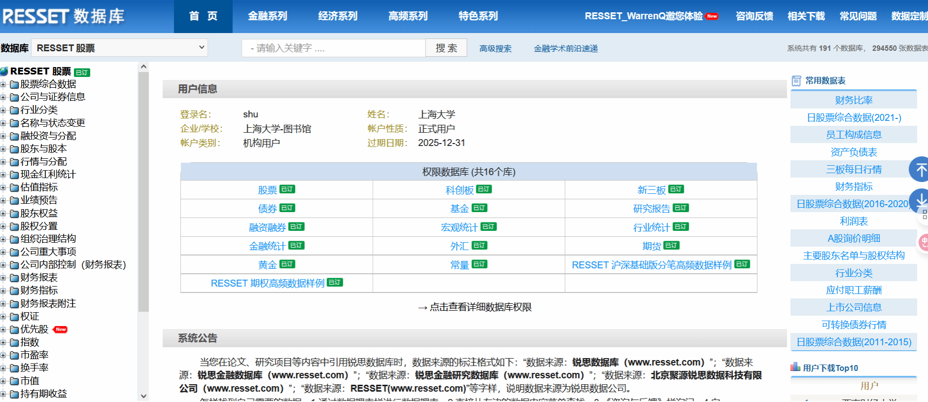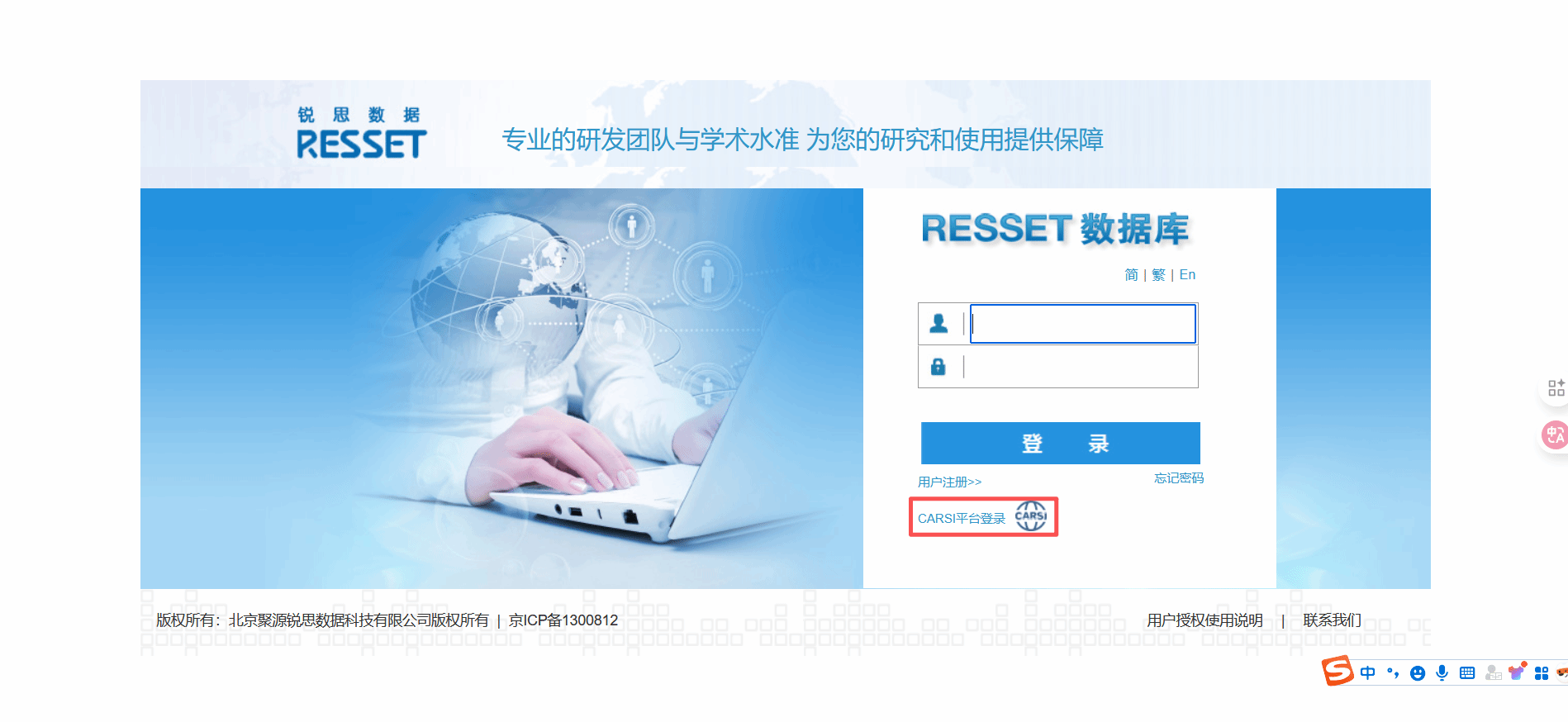 锐思RESSET金融研究数据库 【数据库简介】RESSET金融研究数据库历史数据完整、涵盖广泛,包括股票、新三板、科创板、债券、基金、研究报告、融资融券、宏观统计、行业统计、金融统计、外汇、期货、黄金等,并且研发团队与国内外著名高校合作计算了丰富的衍生指标。充分参照国际著名数据库的设计标准,又结合中国金融市场的实际情况,以实证研究为导向整体设计而成。为模型检验、投资研究、实证研究、学科与实验室建设等提供专业服务的数据平台。 【访问地址】https://db.resset.com/ 太阳集团tcy8722ip段内自动识别登录,如遇到无法识别,可点击CARSI平台登录选太阳集团tcy8722进入一卡通认证即可登录。