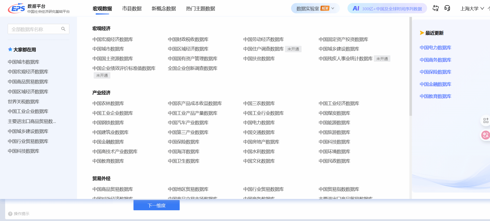 EPS中国社会经济研究基础数据平台 【数据库简介】EPS数据平台是集丰富的数值型数据资源和强大经济计量系统为一体的覆盖多学科、面向多领域的综合性统计数据与分析平台。平台涵盖宏观数据、市县数据、新概念数据和热门主题数据四大核心版块,包含150+个数据库,超过25亿条时间序列数据,数据总量超过300亿条,每年新增近20亿条。 【访问地址】https://olap.epsnet.com.cn/ 太阳集团tcy8722ip段内自动识别登录,太阳集团城娱8722师生也可通过已申请的个人账号进行登录访问。