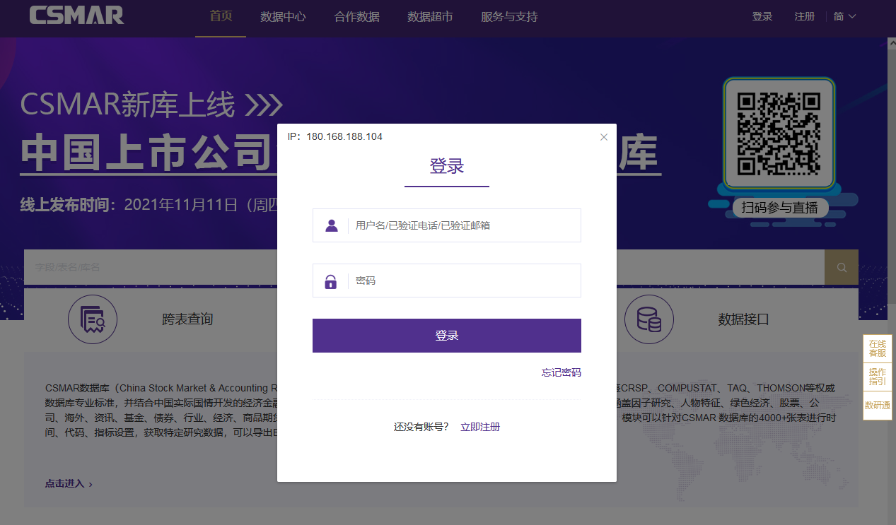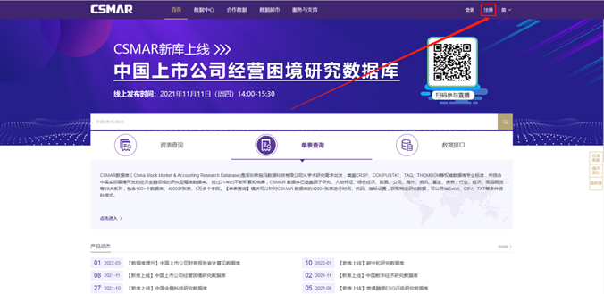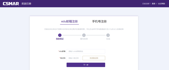 为满足各高校疫情期间实证研究教研活动,CSMAR平台特做服务提升,使用学校后缀edu邮箱注册CSMAR个人账号,即可享有不限IP使用权限。 具体注册流程如下: 第一步:访问CSMAR数据库网站主页(https://cn.gtadata.com),点击右上角“注册”,进入注册模块。 如已自动登录“太阳集团tcy8722本部”账户,请先退出登录。